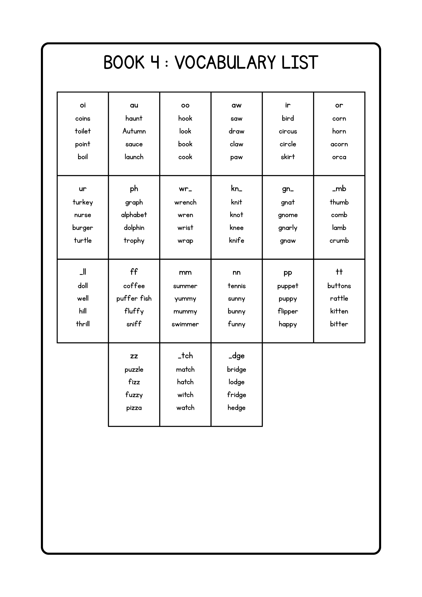 My Colour to Read Book 4 is designed to support children as they explore more complex vowel blends and consonant patterns, including sounds like aw, ir, ph, kn, gn, mm, pp, zz, _tch, and _dge. Each page features phonics-based words paired with colouring activities, helping children recognise advanced letter patterns, practise reading skills, and develop confidence in a fun, hands-on way.